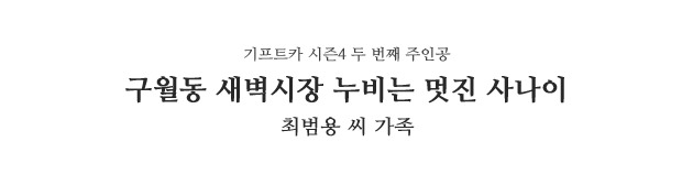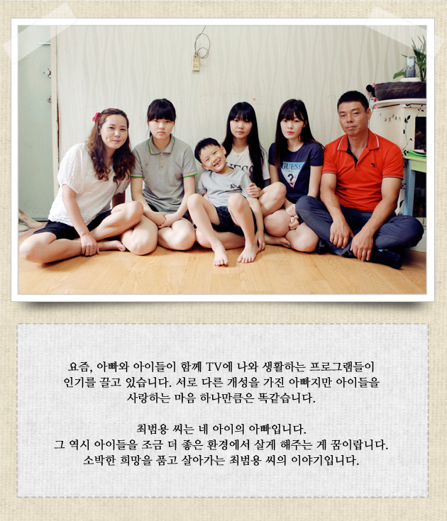 아이들의 행복한 미래를 위해 매일 즐겁게 새벽 공기를 마시고 싶다는 아빠 최범용 씨는 이미 아이들의 우상일지도 모릅니다. 여섯 가족이 매일 웃으며 행복하게 살아갈 수 있도록 희망의 응원을 보내주세요.