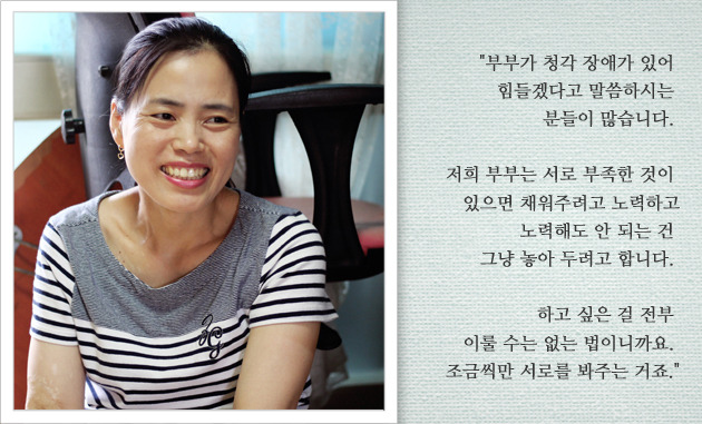김태경 씨의 아내 김미숙 씨 역시 청각장애를 앓고 있었습니다. 보청기에 의지해 세상과 소통을 하고는 있지만, 청각장애 2급의 중증상태입니다. 둘 다 청각장애를 앓고 있었기에 주변에서는 걱정의 목소리와 함께 불편한 시선을 보냈고 그런 것들은 부부를 더욱 외롭게 만들었다고 합니다.