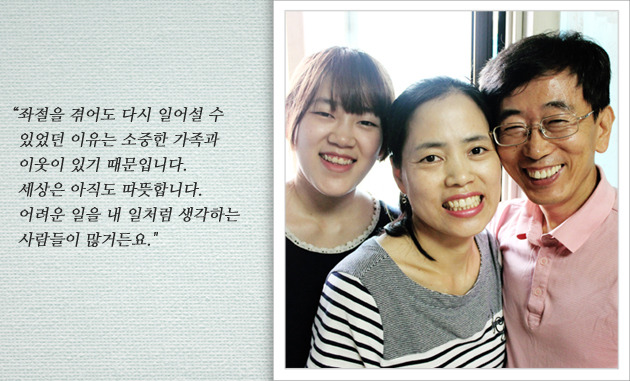 “사고 직후 아내는 일주일간 의식이 없었고 첫째 딸은 오른쪽 다리를 심하게 다쳤습니다. 둘째 딸은 유리가 얼굴에 박혀 3번의 수술을 받아야만 했고요. 지금도 딸들은 교통사고 후유증을 앓고 있습니다. 그땐 아내와 아이들에 대한 죄책감 때문에 잠도 이루지 못했어요.”