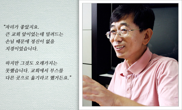 아픈 손가락을 동여매고 김태경 씨가 선택한 것은 구두닦이였습니다. 당시 구두닦이는 잘만하면 높은 수입을 올릴 수 있는 직종이었기에 이 길을 선택하면 돈을 모아 공부도 할 수 있고, 좋은 직업도 가질 수 있을 걸로 생각했었답니다. 태경 씨는 아는 형의 소개로 장사가 잘된다는 명당자리를 찾아갔습니다. 어느 큰 교회 앞, 정말 들은 것만큼 아니 들었던 것보다 훨씬 수입이 좋았다고 합니다. 하지만 교회에서 자리를 옮겨달라는 요청이 들어왔고, 다른 곳으로 옮겨 간 태경 씨는 손님이 없어 결국 문을 닫게 되었습니다.