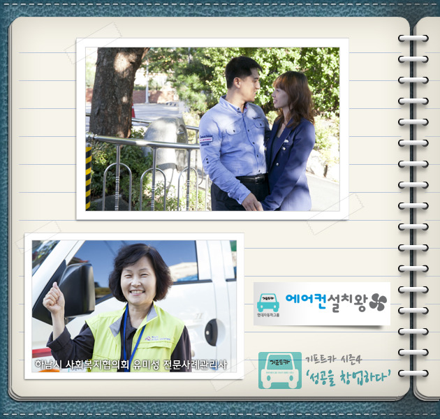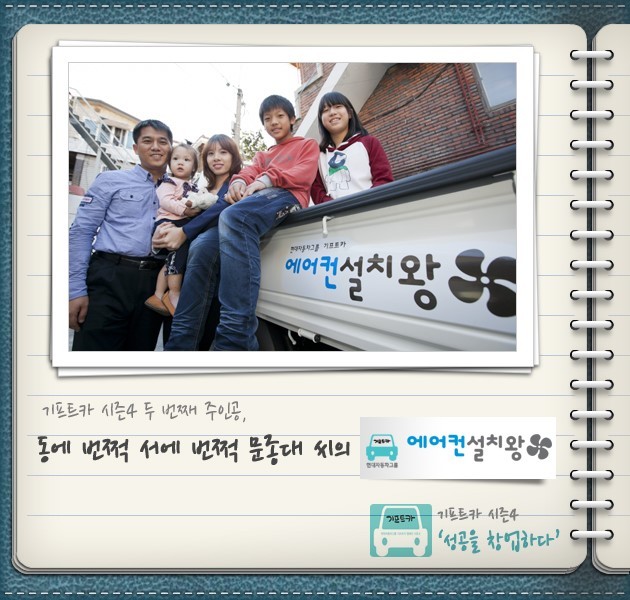 소망이 있으면 말해달라는 질문에 ‘아무것도 바라는 것 없다, 그저 행복하게 다섯 식구가 잘살았으면 좋겠다’며 눈시울을 붉히는 아내의 손을 꼭 붙잡고 고개만 끄덕이는 문종대 씨의 모습, 이보다 더 믿음직스러울 수는 없었습니다. 시련을 이겨내고 여기까지 왔으니, 이제 기프트카와 탄탄대로를 달려나갈 차례입니다! 냉난방기가 필요하면 어디든지 달려가는 '에어컨 설치왕' 문종대 씨! 파이팅 입니다!