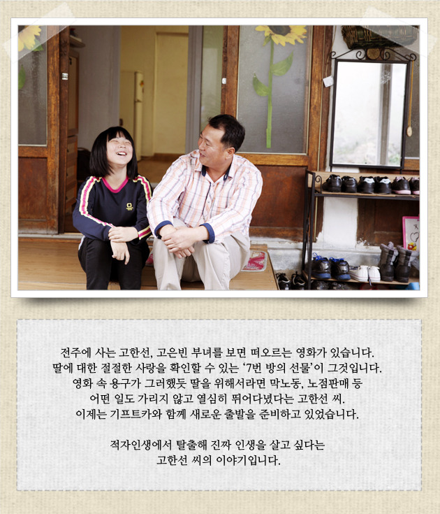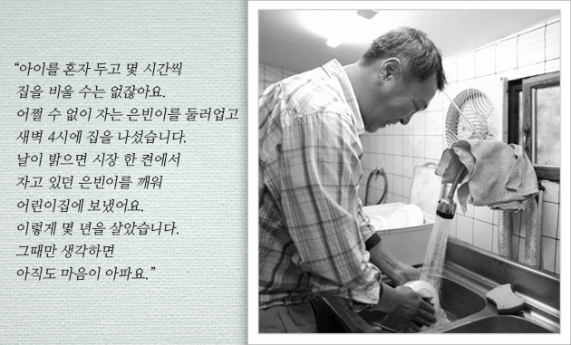 고한선 씨에게 아내의 부재는 이루 말할 수 없는 공허함을 안겨주었습니다. 집안은 갈수록 엉망이 되었고, 앞날은 캄캄하기만 했습니다. 청과물 판매를 마치고 어린이집에 들러 은빈이를 데리고 올 때면 하염없이 눈물만 흘렀습니다. 하지만 그의 곁엔 은빈이가 있었습니다. 잠시라도 한눈을 팔라치면 금방이라도 울 듯한 얼굴로 자신을 다독이는 은빈이를 보며 한선 씨는 다시 한 번 잘 살아야겠다는 결심을 하게 되었습니다.