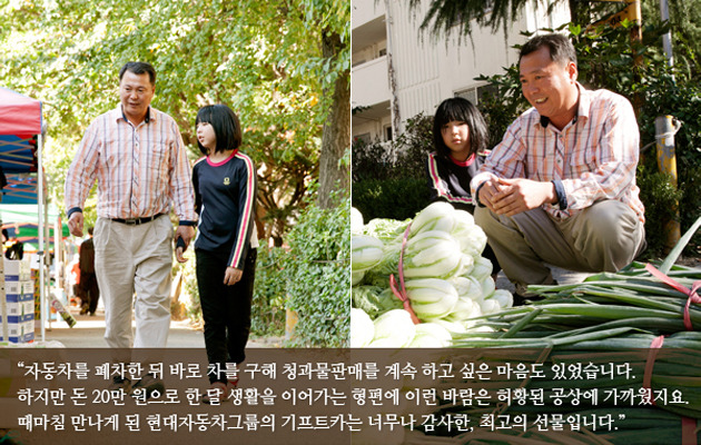 꾸준히 건설 현장 일을 하며 중고트럭이라도 한 대 구입해 청과물 판매를 해야겠다고 다짐한 고한선 씨는 복지관에서 우연히 기프트카에 관한 소식을 듣게 되었다고 합니다. 복지관 선생님의 도움으로 신청서를 내고 매일 밤 기도를 올렸다고 합니다.