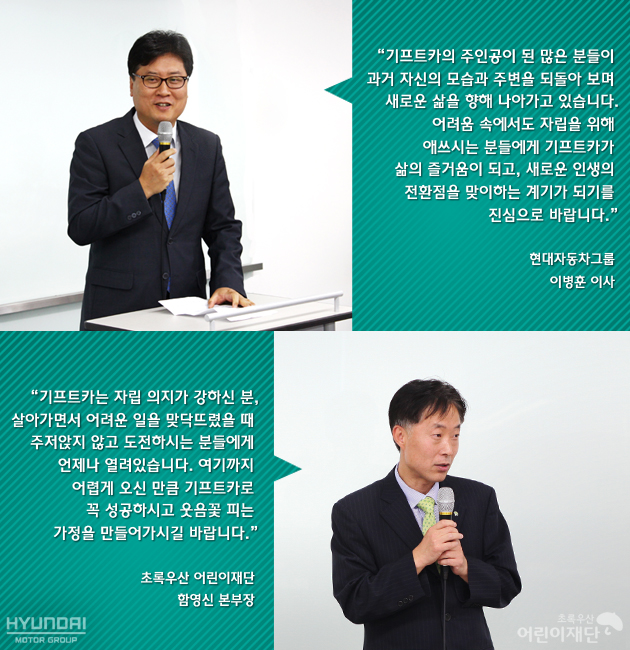 기대했던 대로 주인공들의 얼굴엔 자신감이 넘쳐 보였는데요. 진짜 사업가로 변신할 준비를 마친 여섯 명의 주인공들을 위해 현대자동차그룹의 이병훈 이사님과 초록우산 어린이재단의 함영신 본부장님, 현대차미소금융재단 미소학습원의 이노열 원장님이 축하행사에 참석하셔서 따뜻한 축하 인사를 건네주었습니다.