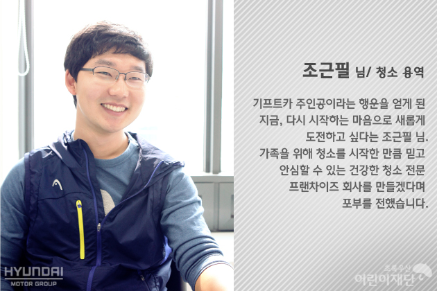 [조근필 님] 기프트카 주인공 중 유일한 20대 청년인 조근필 님은 다른 지원자들보다 어린 나이임에도 불구하고 좋은 기회를 주셔서 감사하다는 인사를 거듭하며, 사업번창에 더욱 힘쓰고 자신처럼 가정을 소중히 생각하는 사람들에게 또 다른 기회를 주고 싶다고 합니다.