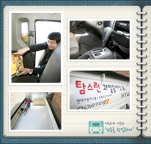 기프트카에서 지호가 제일 마음에 들어 하는 부분은 푹신한 의자! 그리고 이재일 씨는 추운 겨울 꽁꽁 언 몸을 녹여줄 운전석 열선 시트와 앞좌석 뒤편의 작은 공간이라고 합니다. 이동 판매를 할 때는 소소한 짐들이 많아서 수납공간이 꼭 필요한데 이렇게 깨알같이 숨은 공간들이 있어서 정말 편리하다고 하네요.