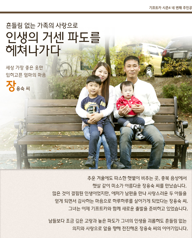 세상은 스스로 돕는 자를 돕는다는 말처럼 언제나 긍정적인 마음으로 앞날을 개척해 나가려고 했던 그녀에게 기프트카라는 인연이 닿게 된 것이었습니다. 남편 이성희 씨도 기프트카와의 만남은 현재 상황에 굴하지 않고 언제나 한 발 앞으로 나갈 줄 아는 아내의 긍정적이고 추진력 있는 성격 덕분이었다고 말합니다.