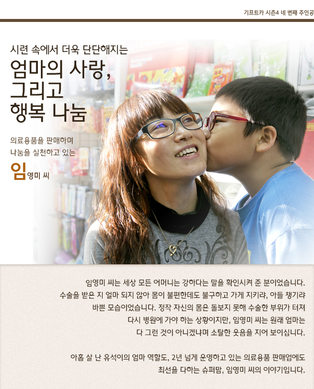 순수한 마음으로 세상을 돕는 엄마. 그리고 의사가 되어 엄마의 행복과 건강 모두를 지켜주고 싶다는 효자 아들 유석이. 두 모자에게 희망과 행복이 찾아오길 기프트카가 함께 응원합니다.