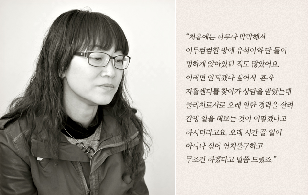 임영미 씨는 다음날부터 바로 대학 병원에서 간병 일을 하게 되었습니다. 임영미 씨가 처음으로 만난 환자는 당뇨병을 앓고 계신 할아버지였습니다. 1년 넘게 그분을 간호하면서도 시간이 날 때마다 틈틈이 다른 환자의 수발도 들었습니다. 간병인으로 살아가는 것은 생각보다 쉽지 않았지만, 그렇게 해야 마음이 편했고 유석이에게도 성실하게 일하는 엄마의 모습을 보여주고 싶어 더욱 열심히 일하게 되었다고 합니다.