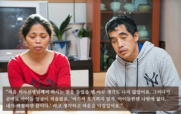 평소 신장이 좋지 않았던 남편의 건강이 급속도로 악화된 것입니다. 어느 날 아침, 두 다리와 얼굴이 퉁퉁 부어 고통스러워하는 남편 김춘하 씨를 발견한 그녀는 남편을 데리고 급히 병원을 찾았습니다. 검사 결과는 다름 아닌 신부전증. 이후로도 계속 쓰러지고 병원에 실려가는 일이 반복되었습니다. 당시 담당 의사는 남편이 길게는 10년, 짧게는 7년 정도를 살 수 있다고 말했습니다.
