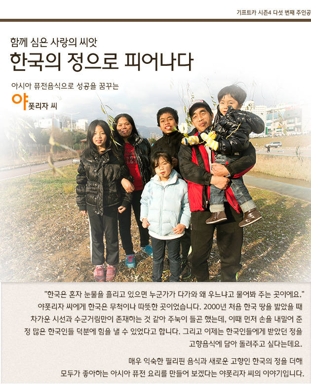 남편의 건강은 조금씩 호전되어갔지만, 여전히 꾸준한 관리가 필요했습니다. 더군다나 일을 하는 것은 불가능한 상황이기에 야폿리자 씨는 곧바로 자신이 할 수 있는 일을 찾기 시작했습니다. 고향 필리핀에서처럼 무슨 일이든 닥치는 대로 열심히 하겠다고 다짐한 야풋리자 씨는 복지기관을 찾아갔습니다. 그러다 그녀의 적극적인 자립의지를 본 다문화가족지원센터에서 야폿리자 씨에게 기프트카를 소개해주었고, 야폿리자 씨는 그날부터 새로운 꿈을 꾸기 시작했습니다. 기프트카를 통해 함께 정을 나눠온 이웃 사람들과 한국인들에게 필리핀 음식을 비롯한 아시아 음식을 맛보게 해주고 싶다는 생각이 들었습니다.