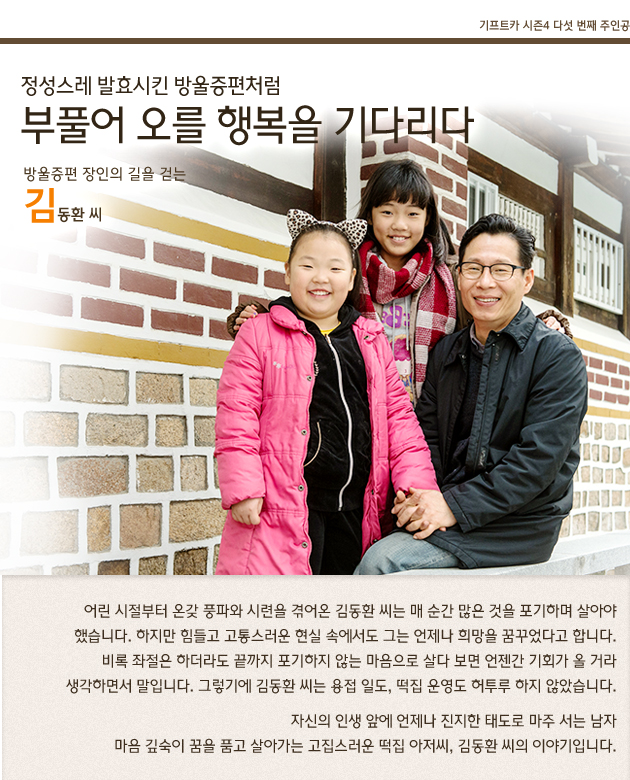 현재 떡집을 운영하고 있는 김동환 씨는 공부도 집안일도 스스로 척척 해내는 두 딸아이 덕분에 일에 더 매진할 수 있다고 합니다. 그런데 그는 유독 떡 중에서도 방울증편만을 고집하고 있었습니다. 2000년 일본 도쿄를 방문한 그는 그들의 장인정신과 전통문화 보존에 깊은 감명을 받았다고 합니다. 그래서 자신이 가장 좋아하고 자신 있어 하는 방울증편의 장인이 되고야 말겠다고 마음먹은 것이었습니다. 자신만의 특별한 방울증편으로 벌써 실용신안까지 받아놓은 김동환 씨는 방울증편에 있어서 만큼은 누구도 따라올 자가 없다고 합니다.