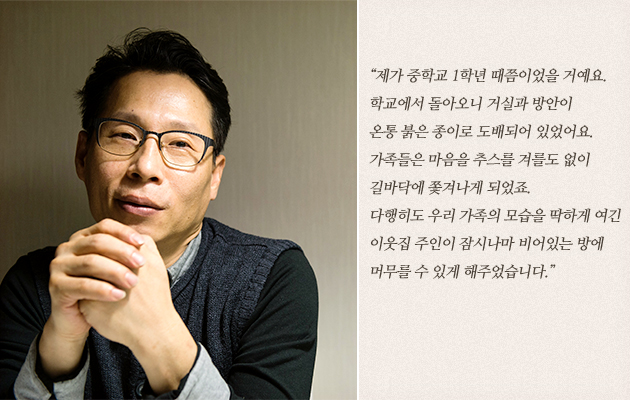 무일푼으로 쫓겨나 이웃집의 빈방에 짐을 푼 김동환 씨 가족은 앞으로 살길이 막막하기만 했습니다. 하지만 어떻게든 집안을 일으켜야겠다는 생각을 한 김동환 씨의 아버지는 외국으로 건너가 일을 해 돈을 부쳐주셨고, 김동환 씨의 어머니는 집에서 떡을 해 시장에 가져다 팔며 어려운 살림을 꿋꿋하게 꾸려 나가셨습니다.