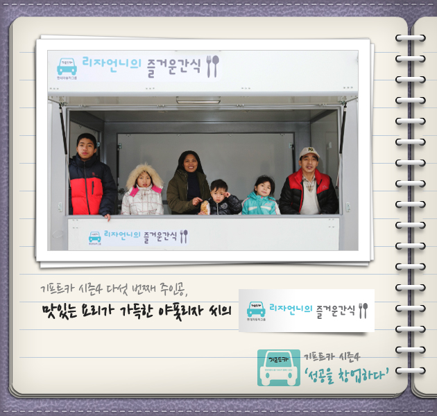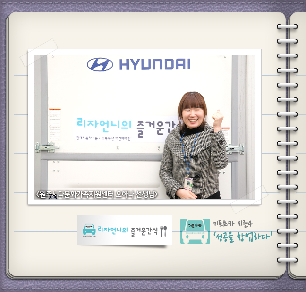 오하나 선생님: 야폿리자 씨가 좋아하는 요리를 사업으로 하시게 된 걸 진심으로 축하 드려요. 다문화음식축제 때 파신 음식들이 정말 다 맛있고 인기가 많아서 잘 될 거라고 확신했거든요. 기프트카가 야폿리자 씨의 꿈에 날개를 달아주신 셈이에요. 주변에 야폿리자 씨 가정처럼 어려움을 겪고 있는 다문화가정이 많은데 이렇게 도움의 손길이 있다면 정말 좋을 것 같아요. 저희 센터도 언제나 열려있으니 주저하지 말고 찾아오세요. 야폿리자 씨도 늘 자신보다 더 힘든 가정을 도와주고 싶어 하셨는데 그 꿈도 곧 현실이 되었으면 좋겠네요. 저도 적극적으로 도울 테니 파이팅 하세요!