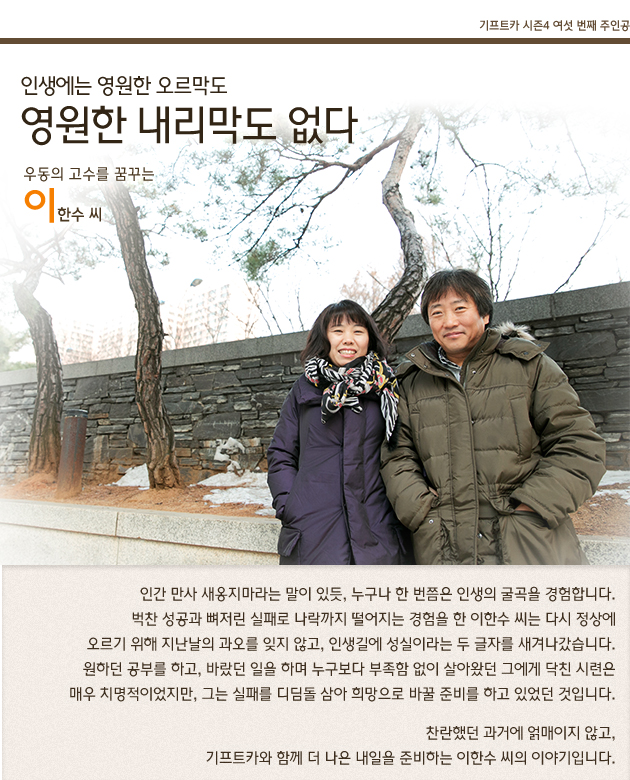 집과 돈, 명예를 한 순간에 모두 잃어버린 이한수 씨는 자포자기하는 대신 가족들을 위해 일거리를 찾아 다녔습니다. 하지만, 이한수 씨가 올라갔던 CEO라는 높은 자리와 오랫동안 했던 공부는 오히려 덫이 되었습니다. 중소기업들은 이한수 씨의 학력과 경력을 부담스러워 했고, 대기업은 이미 중년이 된 그를 받아주지 않았습니다.