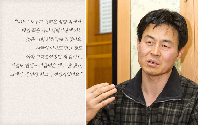 윤주호 씨가 처음 했던 일은 주방용품 회사의 매장관리 일이었습니다. 워낙 성실함과 부지런함이 몸에 배어 있던 터라 윤주호 씨는 어디서든 싹싹하게 일 잘하는 유능한 사원으로 통했다고 합니다. 그렇게 착실하게 돈을 모아가던 윤주호 씨는 서른 살이 되던 해, 새로운 목표를 갖게 되었습니다. 기계적이고 반복적인 일보다는 좀 더 생산적이고, 다른 이들에게 기쁨이 되는 일을 하고 싶다는 것이었습니다. 결국, 고심 끝에 퇴사를 결심한 그는 그간 모아두었던 돈을 투자해 작은 화원을 개업하게 되었습니다. 워낙 사람 상대하는 일을 즐거워했던 윤주호 씨의 적성에 화원 일은 꼭 들어맞았고, 화원의 꽃들은 날개 돋친 듯 팔려나갔습니다.