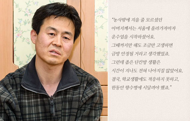 한 칸짜리 방에서 온 가족이 다닥다닥 붙어 누워야만 다리를 뻗고 잘 수 있었던 그 시절, 아직 초등학교 6학년이었던 윤주호 씨는 서울 생활에 쉽게 적응하지 못했습니다. 흙 대신 시멘트 바닥을 걷고, 낮은 건물 대신 높은 빌딩을 지나칠 때마다 자신이 마치 이방인인 것처럼 느껴졌다고 합니다. 게다가 좀처럼 나아지지 않는 어려운 가정 형편에 하고 싶은 것도, 배우고 싶은 것도 전부 참아야만 했기에 학년이 올라갈수록 배움에 대한 결핍까지 더해졌습니다.