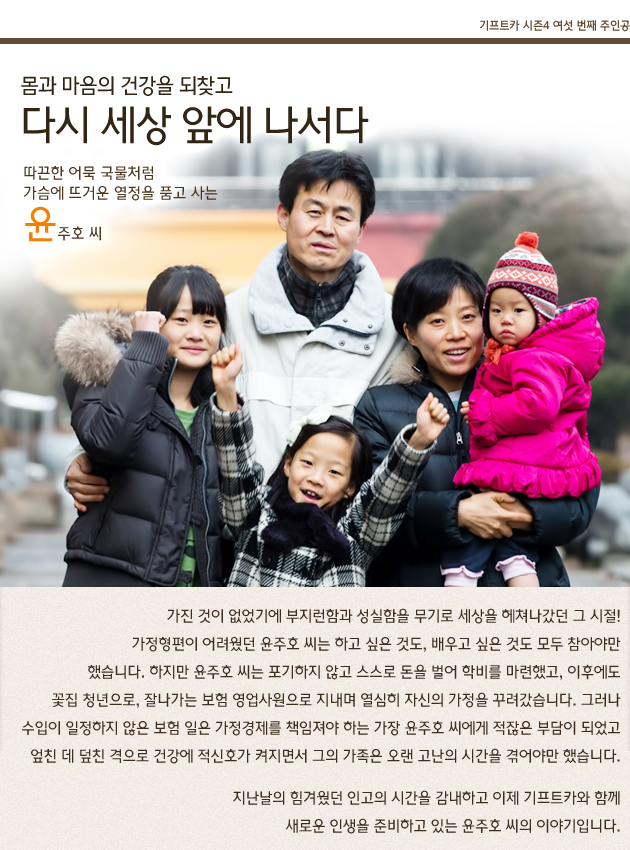 셋째 아이의 탄생으로 윤주호 씨 가족은 잃었던 웃음을 되찾았습니다. 윤주호 씨는 그때의 힘겨웠던 시간을 꿋꿋이 버텨낼 수 있었던 것도 아이들 덕분이었다고 말합니다. 그도 그럴 것이, 첫째 정아는 학교에서 각종 상을 휩쓰는 모범생이고 둘째 현아 역시 미술에 재능을 보이며 항상 부모님의 기쁨이 되고 있습니다. 이렇게 잘 자라주는 아이들을 보며 윤주호 씨는 더욱 큰 책임감을 느꼈고, 성치 않은 몸으로 일자리를 찾기 위해 매일 고용 관련 기관들을 찾아 다녔습니다. 다행히, 1년 동안 계약직으로 장애인 행정 도우미를 하게 되었지만, 그 일도 계약만료가 되어 더는 할 수 없게 되었습니다. 다른 일을 찾기 위해 백방으로 알아보았지만, 별다른 성과 없이 그저 하루하루 지나가는 날들을 걱정과 한숨으로 보내고 있었습니다. 그러던 중 윤주호 씨는 우연한 기회에 기프트카를 만나면서 다시 한 번 활기를 띠게 되었습니다.