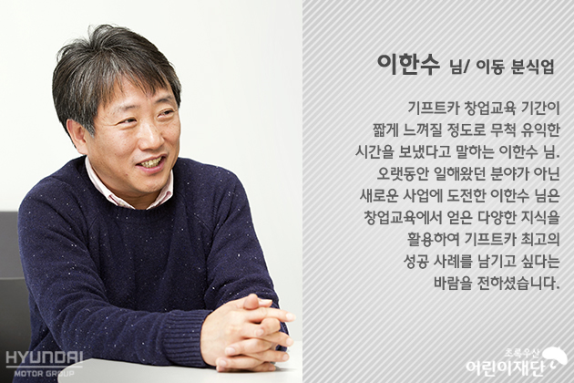 기프트카 창업교육을 받게 된 7명의 주인공은 창업교육을 통해 막연하기만 했던 꿈을 구체화할 수 있었고, 힘든 시간을 겪으며 지치고 위축됐던 마음에 자신감을 채울 수 있어 매우 소중한 시간이었다고 하는데요.