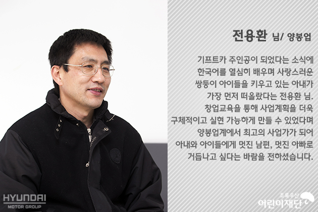각자의 자리에서 최선을 다해온 기프트카 주인공들은 이제 성실함이라는 기본 무기에 철저한 사업가 정신까지 갖추게 되었는데요. 기프트카 시즌4 여섯 번째 주인공들을 대표해 이한수, 윤주호 님이 창업교육을 받으며 느낀 소감을 발표해주셨습니다.