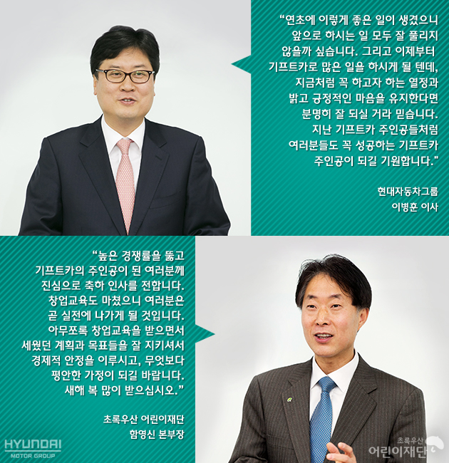 창업교육 수료식과 함께 기프트카 주인공들을 위한 축하행사가 열린 창업교육의 마지막 날, 미소학습원에는 현대자동차그룹 이병훈 이사님과 초록우산 어린이재단 함영신 본부장님, 현대차미소금융재단 미소학습원 이노열 원장님께서 함께 자리해주셨습니다.