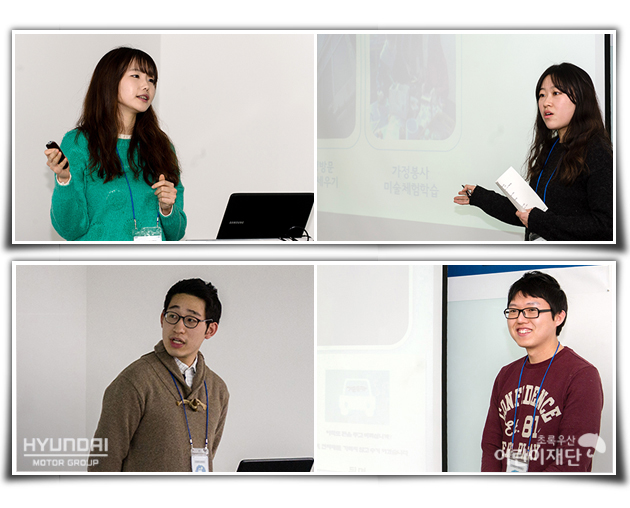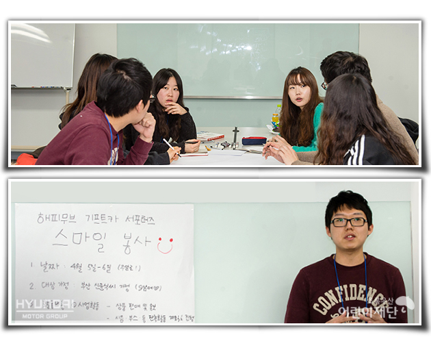 팀별 발표가 끝난 후, 기프트카 서포터즈들은 봉사활동을 하면서 기억에 남는 일이나 개선사항 등을 나누며 더 좋은 활동을 위해 토론하는 시간을 갖게 되었습니다. 이들은 이번 봉사 활동이 지금까지의 어떤 활동보다 매우 특별한 시간이었다고 말하며 소감을 밝혔는데요. 그만큼 다른 봉사자들의 활동에 대해서도 많은 관심을 보이며 발전방향을 함께 고민하고 서로 알게 된 노하우를 공유하는 등 알찬 토의를 이어갔습니다. 이에 현대자동차그룹과 초록우산 어린이재단에서는 지금껏 각자의 자리에서 열심히 봉사하며 나눔을 실천한 기프트카 서포터즈들에게 문화상품권과 책을 선물로 나눠주었답니다.