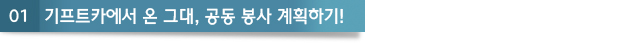 이번 두 번째 이야기에서는 개별 봉사에 이어 공동 봉사를 실천하기 위해 기프트카 서포터즈들이 머리를 맞대고 고민하는 모습과 나눔 리본으로 예쁜 헤어밴드를 만드는 모습을 담아보았습니다. 앞으로 남은 3개월간의 각 팀별 활동은 물론 마지막 공동 봉사활동까지 최선을 다하기 위해 노력하는 기프트카 서포터즈 1기를 지금 함께 만나보시죠!