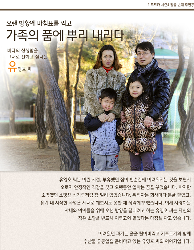 이제 유영호 씨는 사랑하는 가족과 소박하고 단란하게 살고 싶다는 자신의 소망에 한발 더 가까워졌습니다. 유영호 씨의 바람은 부자가 되는 것도, 명예를 얻는 것도 아니었지만, 유영호 씨가 꿈꾸던 안정적인 삶은 쉽게 허락되지 않았고 꿈을 펼칠 기회도 쉽게 오지 않았습니다. 그러나 유영호 씨는 좌절하지 않았고, 이번에는 든든한 기프트카와 함께 다시 또 세상을 향해 도전장을 내밀었습니다. 거친 파도를 잘 헤쳐온 유영호 씨에게 폭풍 후 잔잔해진 바다처럼 맑고 평온한 날이 찾아오길, 기프트카가 기원합니다.