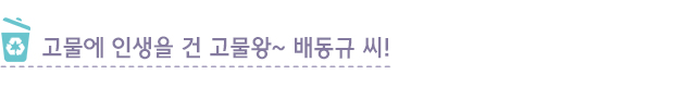 김진정 대리님: 배동규 씨는 모든 고물을 폐기물이 아닌 보물로 바라보세요. 지금만큼의 열정과 집념을 간직해 나간다면 꼭 성공하실 거라고 생각합니다. 앞으로도 계속해서 응원하겠습니다. 배동규 씨 파이팅!
