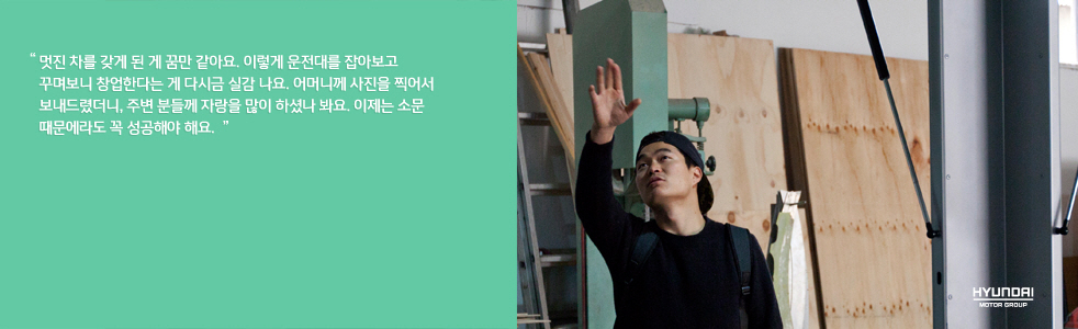 멋진 차를 갖게 된 게 꿈만 같아요. 이렇게 운전대를 잡아보고 꾸며보니 창업한다는 게 다시금 실감 나요. 어머니께 사진을 찍어서 보내드렸더니, 주변 분들께 자랑을 많이 하셨나 봐요. 이제는 소문 때문에라도 꼭 성공해야 해요.