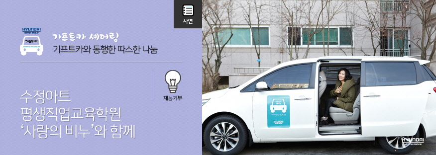 지난번에 MBC 성우실 봉사단 ‘동화이야기 메아리’ 분들과 함께한 기프트카 셰어링을 소개해 드렸었는데요, 이번에 '기프트카 셰어링'이 소개해 드릴 두 번째 주인공 역시 우리 주변에서 쉽게 만날 수 있는 평범한 이웃 중 한 사람입니다. 조금 다른 점이 있다면, 자신의 재능을 사회를 위해 꾸준히 기부해오고 있다는 점이죠. 바로 경기도 용인시에서 평생교육직업학원을 운영하고 있는 유선정 님입니다.