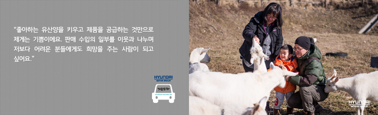 기프트카와 함께 할 앞날, 영학 씨는 하나하나 꼼꼼히 메모를 이어갑니다. 우선 남원 인근 지역에 정기 배달 고객을 늘리고, 지역축제나 어린이집 등에 직접 찾아가 영업을 시작할 예정입니다. 제품을 신선하게 보관해주는 것은 물론 냉장탑의 다른 면을 활용해 홍보할 수 있어 여러모로 도움이 될 것 같다고 말하는 영학 씨. 요구르트를 찾는 고정 소비자가 늘고 경영이 안정화되면, 잠시 멈추고 있는 치즈 제조도 시작할 계획이라고 전합니다. 유산양이 어떤 동물인지 알려주고 직접 농장 일을 해보는 체험 프로그램 또한 본격적으로 재가동을 준비 중입니다. 영학 씨는 한 번에 욕심내지 않고 천천히 산양유를 알리며 소비자들과 함께 더 건강해지고 더 행복해지고 싶다고 말합니다.