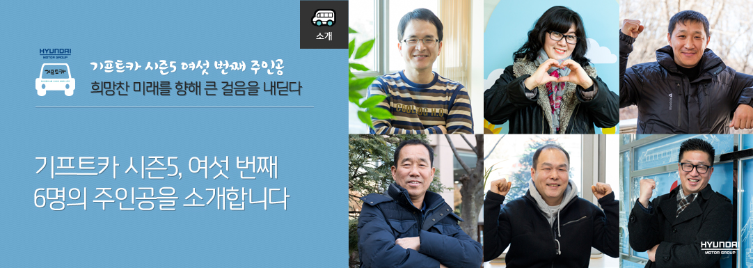 지금까지 기프트카 캠페인 시즌5의 여섯 번째 주인공을 만나보았습니다. 이들은 굳센 의지와 무한한 용기로 삶을 변화시키기 위해 떨쳐 일어났습니다. 여섯 주인공들이 희망찬 미래를 아름답게 펼쳐나갈 수 있도록 함께 응원해주세요!