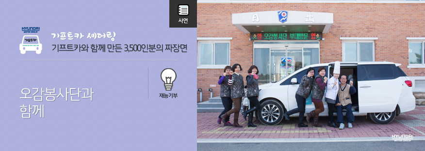 봉사를 계획하면서 경기도 성남시에서 속초까지 여러 인원이 이동가능하고 음식 재료, 장비를 운반할 차량이 부족해 고민했다는 오감봉사단. 그러던 중 기프트카 셰어링 TV 광고가 기억나서 혹시나 하는 마음으로 신청해보았다고 하는데요. 이렇게 이어진 오감봉사단과 기프트카 셰어링의 인연은 오감봉사단에게 기프트카 제공과 지원금으로 힘이 되어주었습니다.