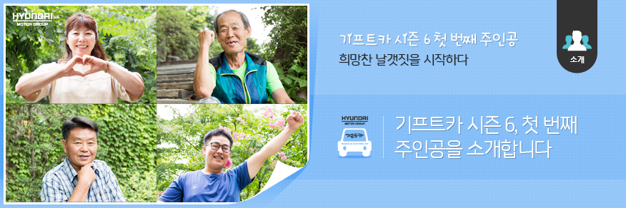 현대자동차그룹 기프트카 캠페인 시즌6의 첫 주인공을 차례대로 만나봤습니다. 새로운 삶을 위해 전력을 다하는 이들 곁에는, 창업성공의 도움이 될 기프트카가 함께 달립니다. 희망을 가지고 힘차게 일어난 네 명의 주인공들을 뜨겁게 응원해주세요!