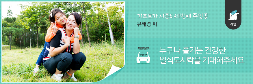 누구든 유태경 씨의 도시락을 맛보면 엄지손가락을 치켜세웁니다. 좋은 재료와 탁월한 솜씨로 맛을 낸 태경 씨 표 음식은 늘 찾는 손님이 많았습니다. 하지만 동업 실패와 갑작스러운 딸의 건강악화로 사업을 정리해야만 했던 태경 씨. 아픈 딸의 곁을 지키며 치료비 마련할 길이 막막했던 태경 씨에게 기프트카가 찾아왔습니다. 기적처럼 기프트카를 만나 희망의 나날을 그리고 있는 태경 씨의 이야기를 들려드립니다.