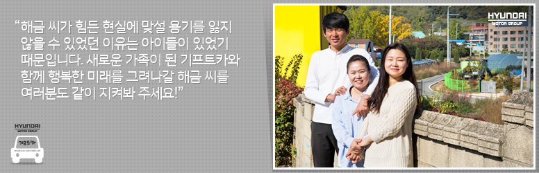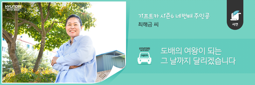 기프트카와 함께 희망찬 미래로 나아가고 싶은 해금 씨에겐 영원한 소망이 하나 있습니다. 차가운 현실에 맞설 용기를 잃지 않게끔 항상 힘이 되어준 두 아이에게 보답하는 일입니다. 부족한 환경에서도 번듯하게 자라준 아이들이 한없이 고맙다는 해금 씨. 사업이 번창하면 아이들의 꿈을 든든하게 지원하는 엄마가 되고 싶다 말합니다. 그 소망의 첫발을 이제 새롭게 가족이 된 기프트카와 함께 내딛습니다. 여러분도 기프트카와 함께 쉼 없이 달려갈 해금 씨의 도전에 힘찬 응원을 보내주세요!