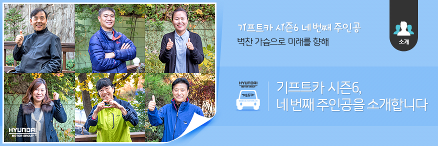현대자동차그룹 캠페인 시즌6의 네 번째 주인공이 탄생했습니다. 여섯 명의 주인공은 두려움 반 설렘 반으로 기프트카와 함께할 성공의 내일을 꿈꾸고 있습니다. 어려움 속에서 남몰래 눈물 흘리던 과거를 딛고 용기 있게 일어선 이들의 이야기가 궁금하시죠? 지금 만나러 갑니다!