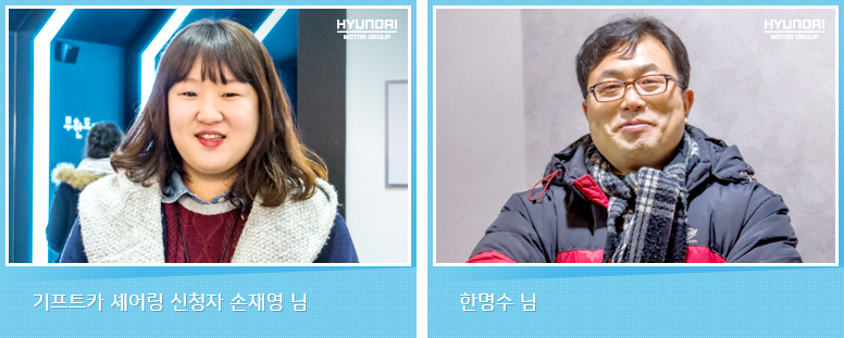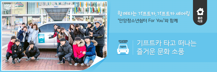 손재영 님 : 겨울방학을 맞은 쉼터 아이들과 재미난 추억을 만들고 싶어서 킨텍스에서 열리는 ‘무한도전 엑스포’ 티켓을 어렵게 구해놨는데, 선생님들과 아이들 포함해 20여 명이 함께 움직일 차량 확보가 여의치 않았어요. 고민이 깊어가던 무렵 TV에서 ‘기프트카 셰어링’ 광고를 보게 됐어요. 기프트카 셰어링 홈페이지에 들어가 ‘우리도 신청할 수 있을까?’ 조목조목 내용을 읽어봤더니 소외된 이웃과 아이들을 위한 ‘좋은 이웃 셰어링’이라는 테마가 있더라고요. 이거다 싶어서 얼른 신청서를 작성했죠. 기프트카 셰어링 덕분에 쉼터 아이들과 선생님들이 함께 좋은 추억을 만들 수 있었습니다. 아이들의 문화 소풍에 든든한 발이 되어준 기프트카, 고맙고 사랑합니다.