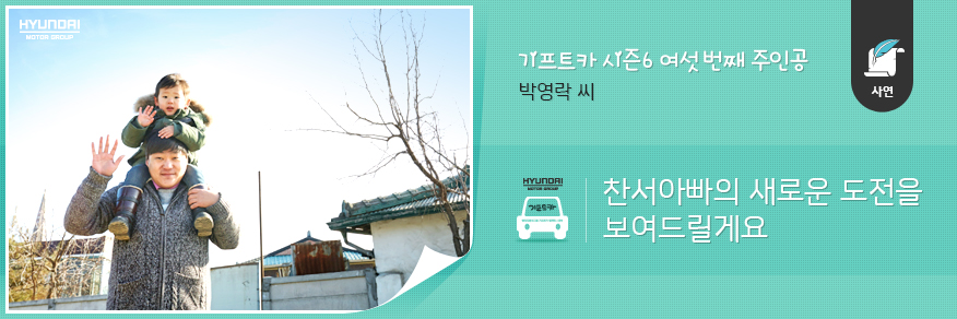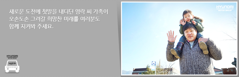 기프트카를 알게 되면서 꼬여있던 실타래가 풀리듯 순조롭게 사업을 꾸려가고 있는 영락 씨. 그동안의 답답함을 뻥 뚫어줄 기프트카가 제자리걸음을 하던 사업에도 돛을 달아줄 거라 믿고 있다는데요. 적극적으로 사업영역을 넓히는 것을 시작으로 번듯한 사업가가 되는 그 날까지, 영락 씨는 차근차근 앞으로 나아갈 계획입니다. 무엇보다 영락 씨와 부모님 그리고 찬서까지, 네 가족이 보다 여유롭게 살아갈 수 있도록 매사 최선을 다할 영락 씨입니다. 새로운 도전에 여념이 없는 영락 씨와 네 가족이 오손도손 그려갈 희망찬 미래를 여러분도 함께 지켜봐 주세요.
