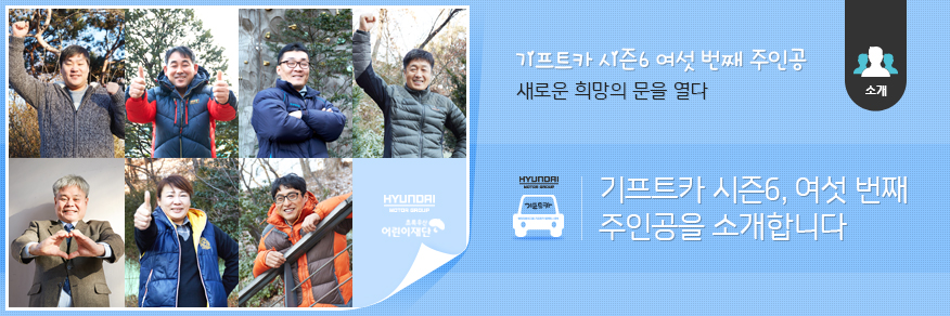 지금까지 현대자동차그룹 기프트카 캠페인 시즌6 여섯 번째 주인공의 이야기를 들어보았습니다. 기프트카를 통해 기분 좋은 변화를 만들어갈 주인공들의 모습이 기대됩니다. 새로운 도전을 앞둔 주인공들에게 따뜻한 격려의 박수를 보내주세요!