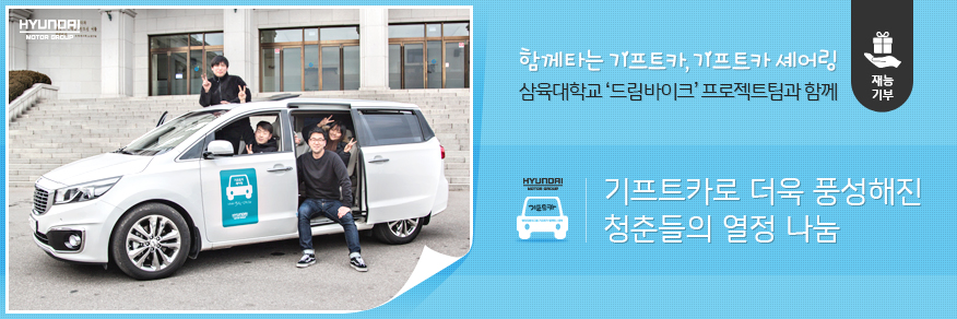 좋은 생각을 공유하는 착한 자동차 ‘기프트카’를 통해 젊은 청년들의 열정 넘치는 나눔에 활력이 더하고 있습니다. 청춘들이 열정이 더욱 아름답게 느껴졌던 시간! ‘기프트카 셰어링’도 응원하겠습니다.