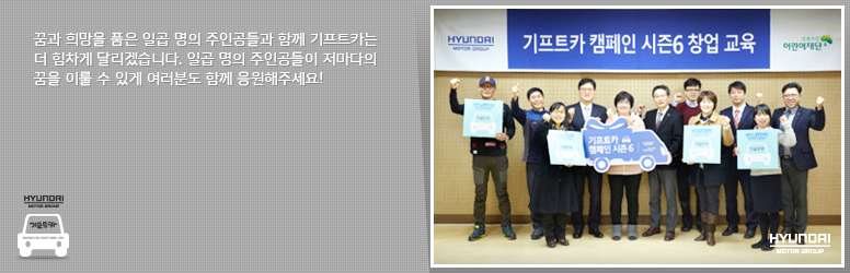 몸을 한껏 움츠리게 하던 매서운 추위를 밀어내고 봄기운이 피어난 어느 날, 기프트카 시즌6 일곱 번째 주인공들의 창업교육 수료식 축하행사가 열렸습니다. 희망찬 새 출발을 다짐한 일곱 번째 주인공들의 축하행사 현장을 소개합니다!