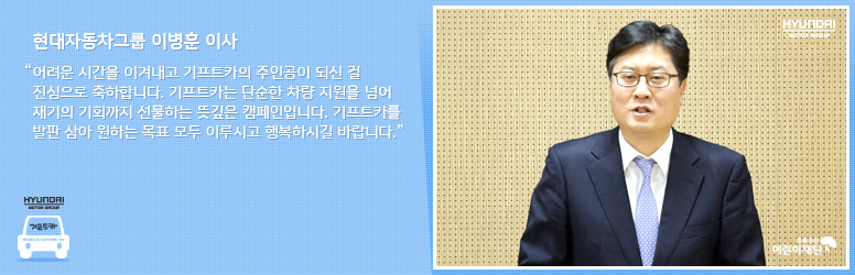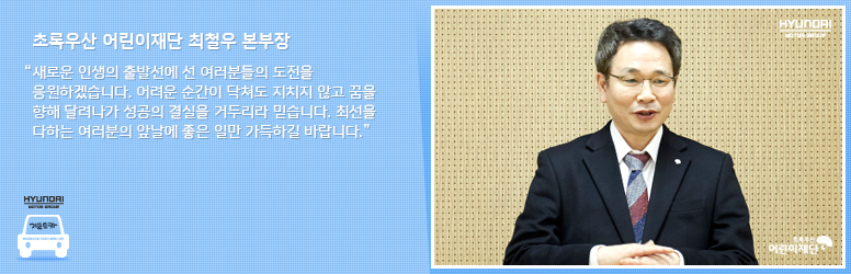 축하행사에는 현대자동차그룹 이병훈 이사와 초록우산 어린이재단 최철우 본부장이 함께 자리해 주인공들에게 힘찬 응원의 메시지를 전했습니다.