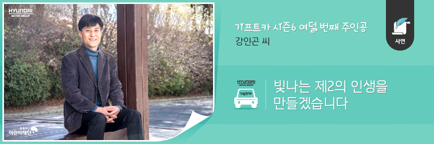 밤낮없이 일하는 아내를 대신해 육아를 전담하는 와중에도 틈틈이 사업을 준비해오길 1년. 하지만 세차 장비를 싣고 고객을 찾아가려면 무엇보다 차가 절실하게 필요했습니다. ‘차를 구할 방법이 없을까?’ 고민하던 인곤 씨에게 좋은 기회가 찾아왔습니다. 인터넷 기사를 통해 기프트카 캠페인을 알게 된 것입니다. 차량을 활용한 창업 계획이 있는 사람에게 차량은 물론 창업 자금까지 지원해준다는 이야기를 들은 인곤 씨는 망설임 없이 신청서를 냈습니다.