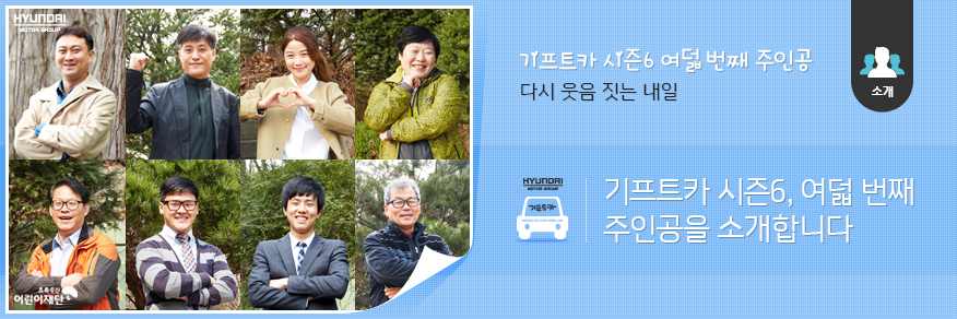 현대자동차그룹 기프트카 캠페인 시즌6의 여덟 번째 주인공을 소개해드립니다. 힘든 시간을 견디고 마침내 기프트카를 만나게 된 여덟 명의 주인공은 새로운 내일을 꿈꾸기 시작했습니다. 잃어버린 웃음을 되찾고 행복을 향해 달려갈 주인공을 지금 만나봅니다.