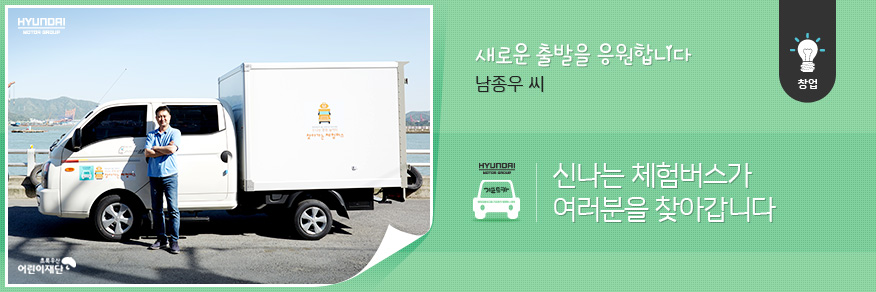 종우 씨는 ‘찾아가는 체험버스’란 이름으로 힘차게 첫 걸음을 내디뎠습니다. 찾아가는 체험학습 사업은 이제까지 없던 새로운 도전이라 걱정이 앞설 법도 하지만 종우 씨는 어느 때보다 열정과 설렘으로 가득 차 있습니다.