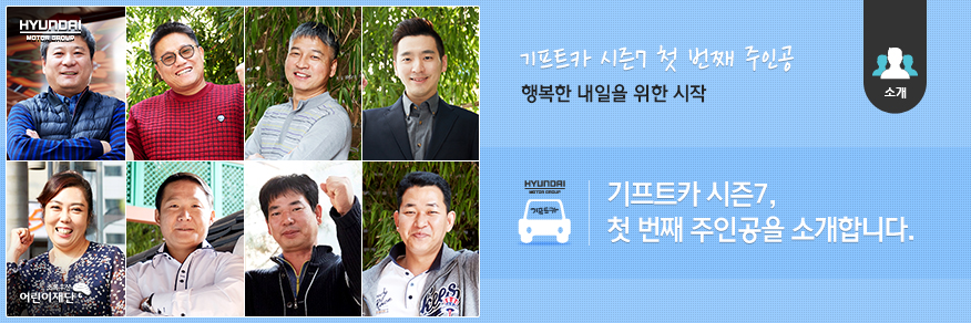 당신의 꿈을 위해 달리는 현대자동차그룹 기프트카 캠페인 시즌7 대망의 첫 번째 주인공들이 탄생했습니다. 설레는 마음으로 모인 주인공들은 기프트카를 통해 성공적인 미래를 꿈꾸고 있습니다. 힘든 역경을 이겨내고 기프트카와 함께 행복한 내일을 위해 희망의 날갯짓을 시작한 주인공들을 만나봅니다.