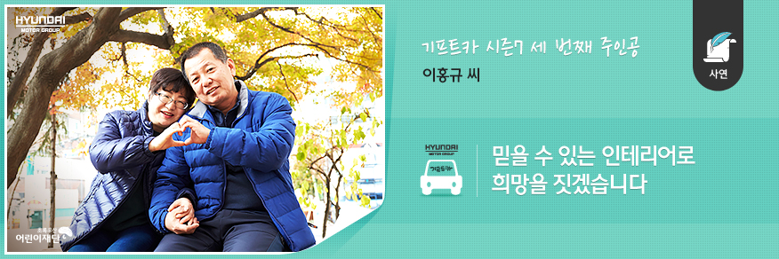 30년 경력의 인테리어 전문가 이홍규 씨는 대전 건축 업계에서도 손에 꼽는 뛰어난 기술을 가지고 있습니다. 세상의 거센 풍파에 잠시 흔들리기도 했지만 기프트카를 만난 홍규 씨는 오뚝이처럼 벌떡 일어나 제2의 인생을 시작하려고 합니다. 고객에게 편안한 안식처를 제공하고 싶다는 '일등 인테리어 기사' 홍규 씨. 기프트카와 함께 성공적인 창업을 준비하고 있는 홍규 씨의 이야기를 전해드립니다.