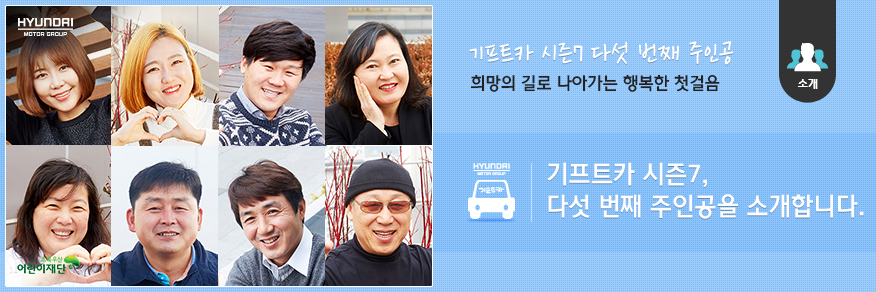 현대자동차그룹 기프트카 캠페인 시즌7의 다섯 번째 주인공을 소개합니다. 본인만의 장기와 특색을 살린 사업계획과 남다른 열정으로 창업에 도전하는 여덟 명의 주인공들. 기프트카를 만난 주인공들의 얼굴에 행복한 기운이 가득합니다. 희망을 향한 도전의 첫걸음을 뗀 기프트카 시즌7의 다섯 번째 주인공을 소개합니다.